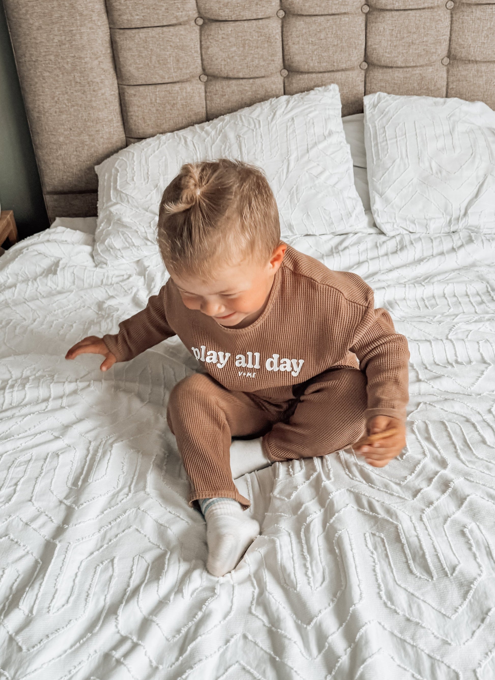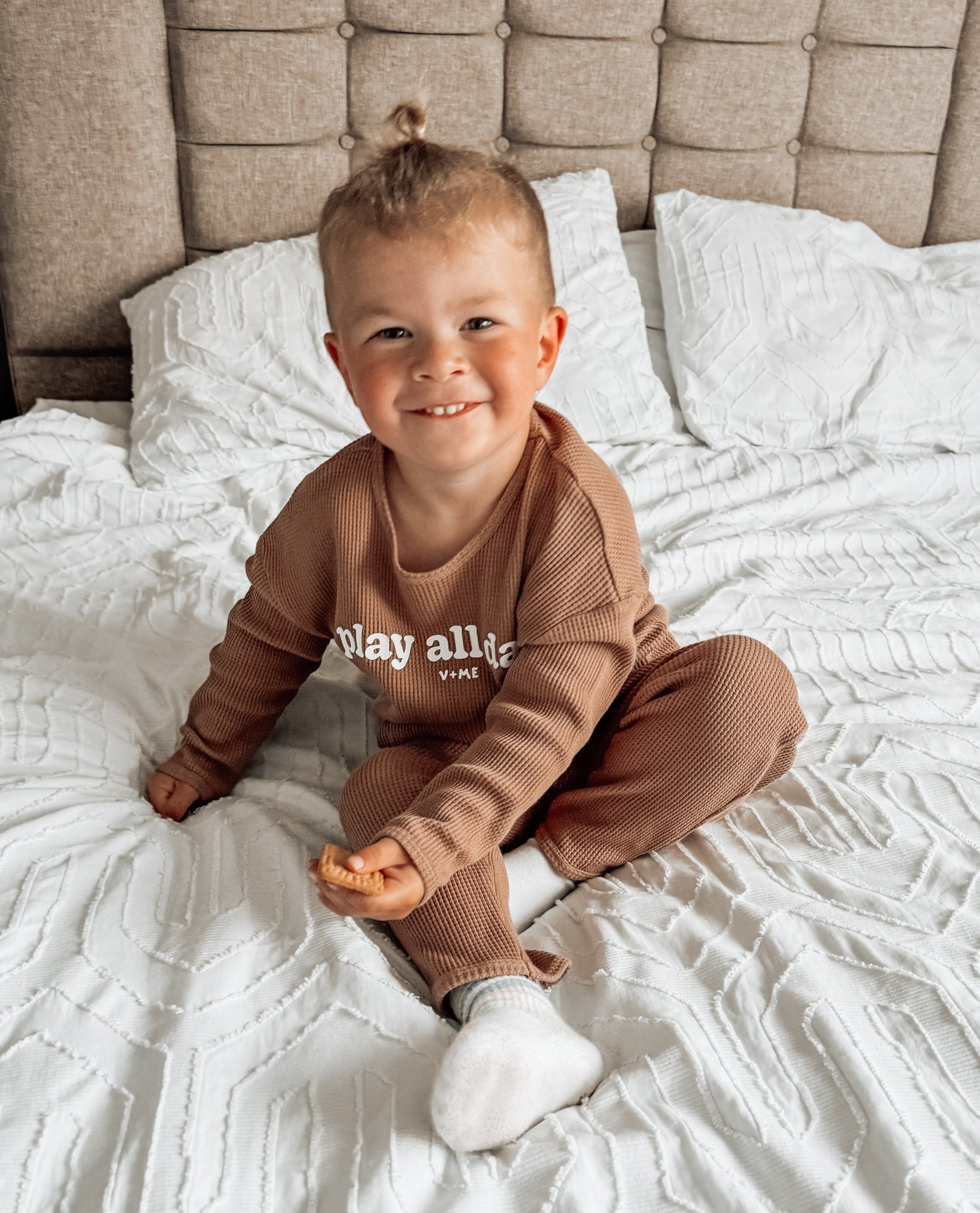 Your new favourite lounge set is here! Crafted from our soft 100% Cotton Waffle fabric it'll keep your little ones comfy and looking cute at home or on the go.