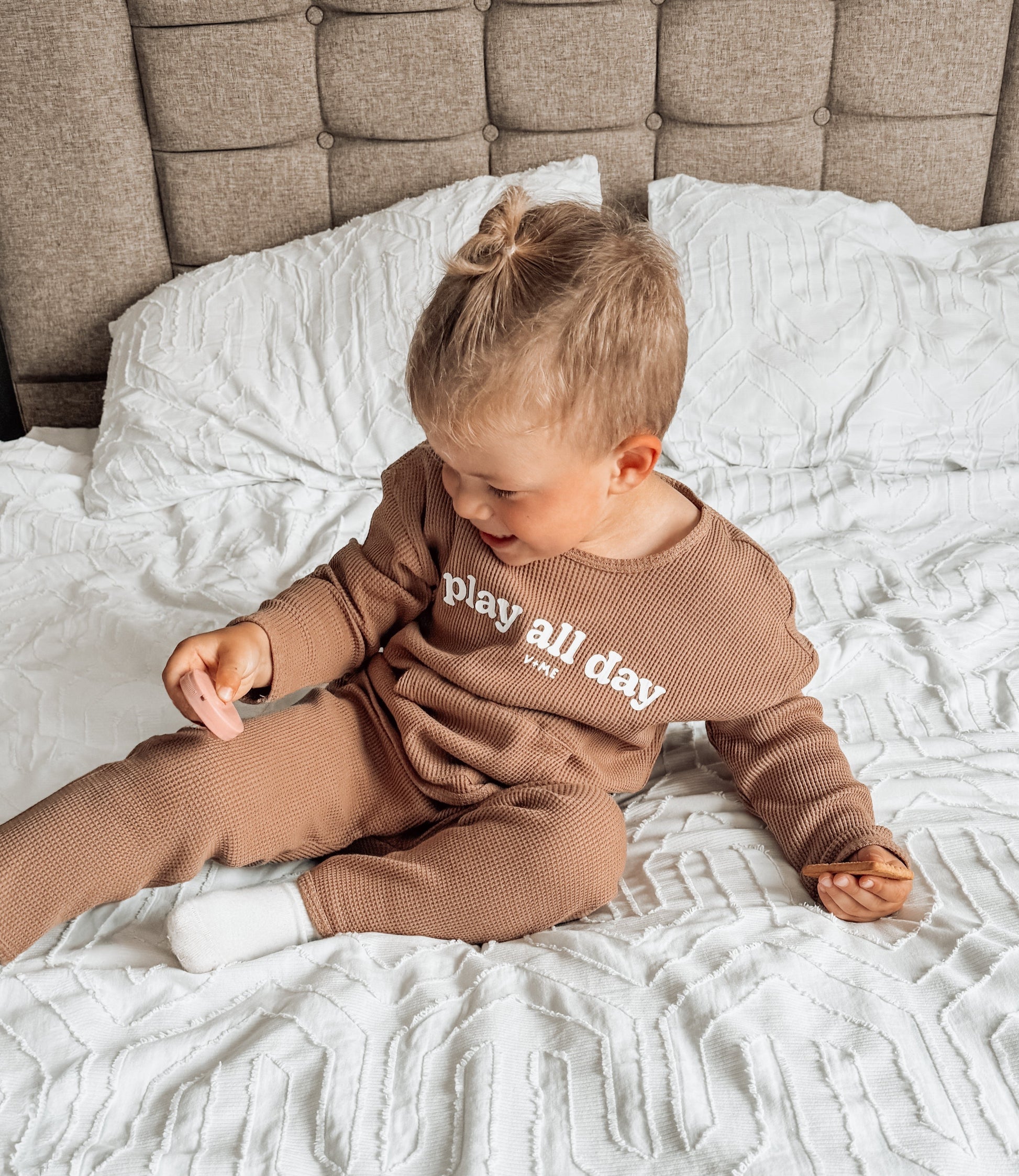 Our cotton waffle is a medium weight, breathable fabric, designed to stretch and move with your little hurricane. So even if "Lounging" is a foreign concept to them, their clothes won't let them down!